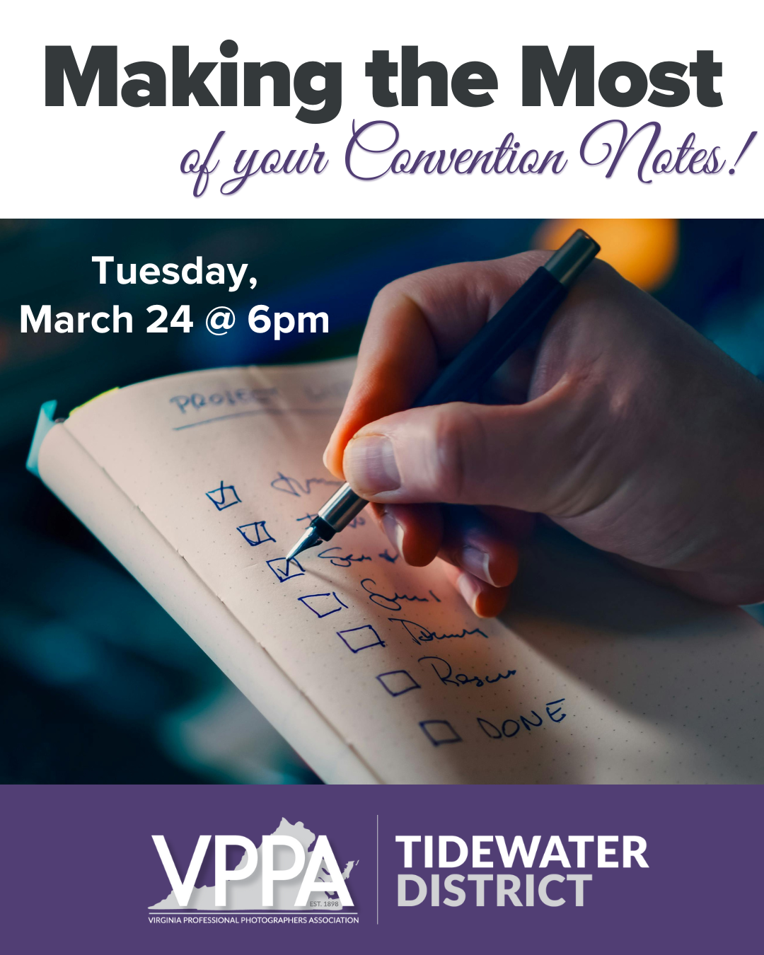 We’ve all been there—pages of brilliant convention notes, big dreams, and then… life happens. Let’s change that! Join us on Tuesday, March 24th, for a lively district meeting all about turning those “someday” ideas into right-now action. We’ll talk goal setting, simple action plans, and how to actually implement what you learned so it makes a real difference in your studio, your photography, and your bottom line. Bring your notes, your questions, and your enthusiasm—leave with clarity, motivation, and a game plan you’ll be excited to put into motion. No more great ideas gathering dust on the shelf!
