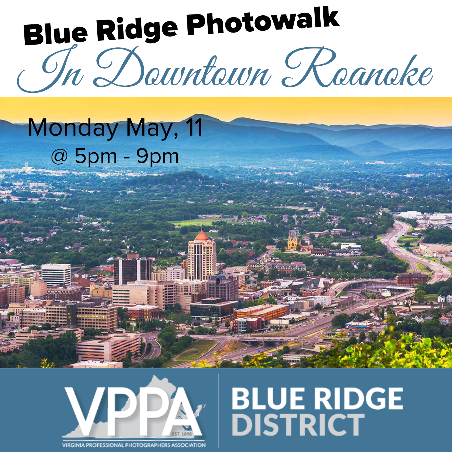 Join the Blue Ridge District for a fun and relaxed evening photo walk in downtown Roanoke on Monday, May 11 from 5:00 PM to 9:00 PM. We’ll meet at Starbucks, 110 Franklin Road SE, Roanoke, VA 24011, then head out as a group to explore, shoot, and connect.